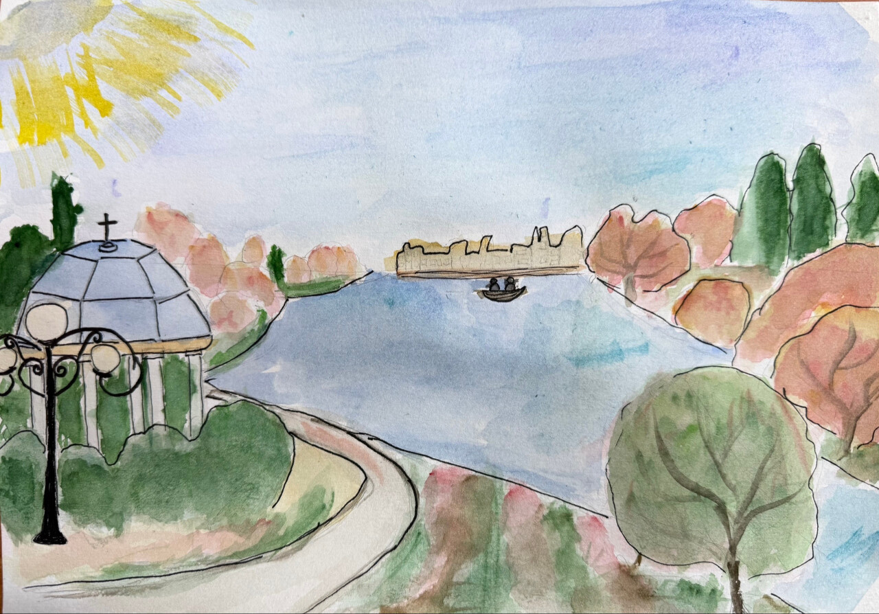 Ротонда Петра и Февронии на реке Везёлке, 2025, акварель, 21*29.7, 12 лет