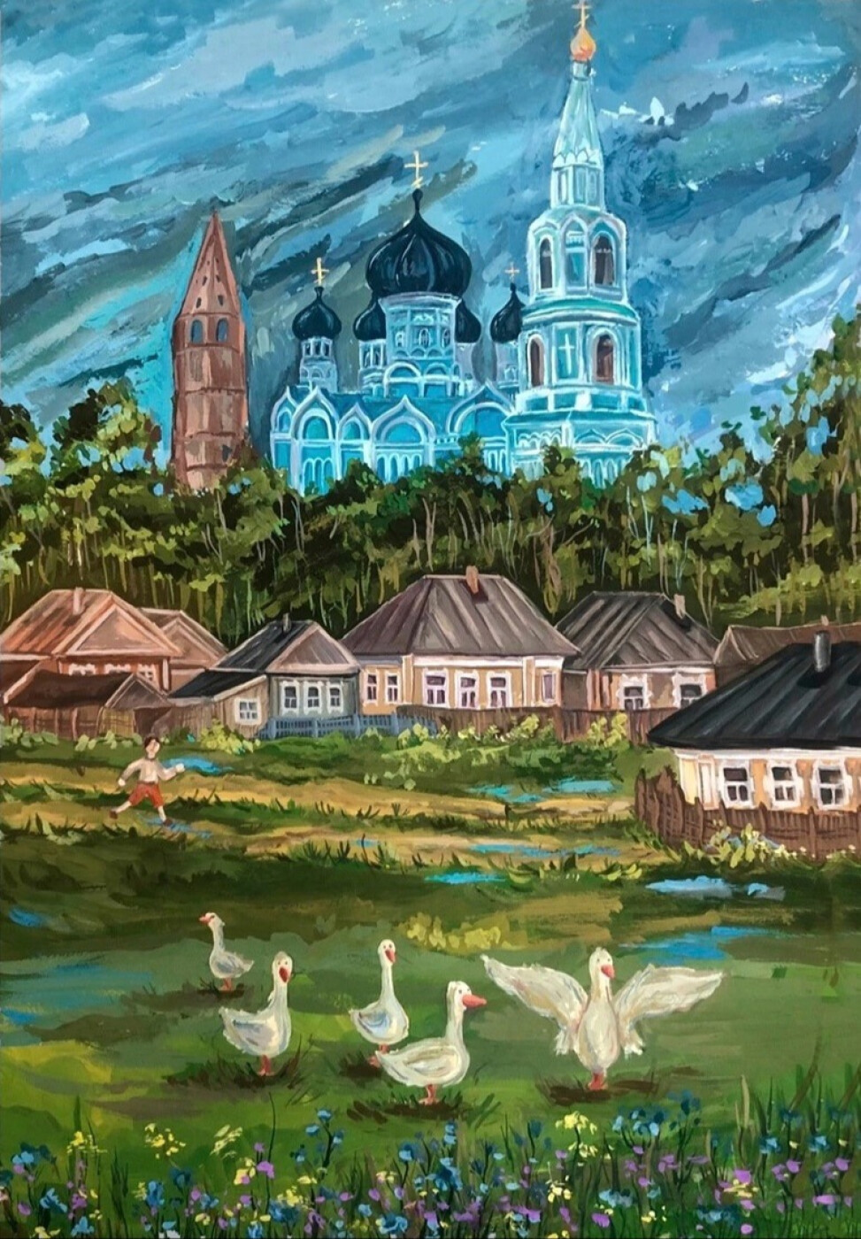 На создание композиции меня вдохновил уютный пейзаж родного города: деревянные домики с резными наличниками, зелёные луга, украшенные полевыми цветами, и величественный Троицкий собор, возвышающийся над деревьями. Троицкий собор — символ духовного единства. В этой композиции я выражаю свою идею: счастье — в мелочах. В запахе мокрой травы, крике гусей, лучах солнца, пробивающихся сквозь облака. Оно рядом, нужно только остановиться и заметить. Жители Яранска, кажется, это поняли. Их счастье — в родном крае, тепле домашнего очага и красоте мира.