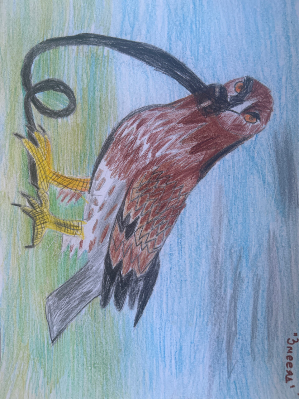 Птица‑охотник, 2026, бумага, цветной карандаш, 21 на 29,7. 7 лет.