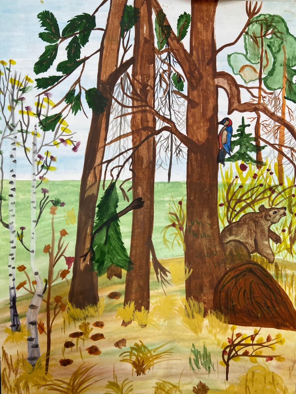 Рисунок «Осенний лес», олицетворяет расцвет природы в осеннюю пору, яркие оттенки, дикие животные, гармоничная природа- все это живет в едином ритме. На создание работы меня вдохновили родные пейзажи вблизи нашего домика в деревне.