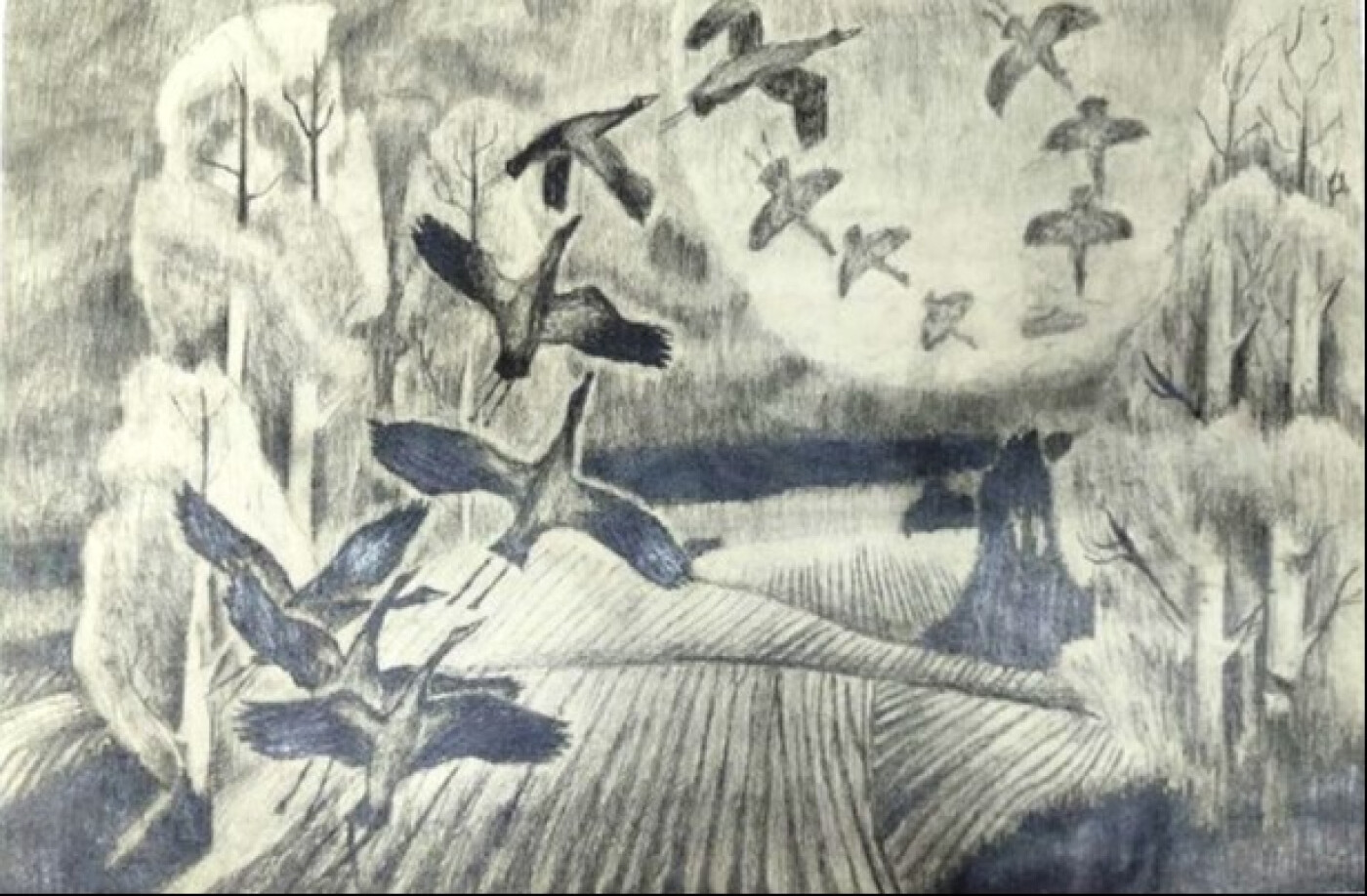 "Летят в бессмертье журавли", 2026 г., бумага, карандаш, 42,0×59,4, 12 лет.