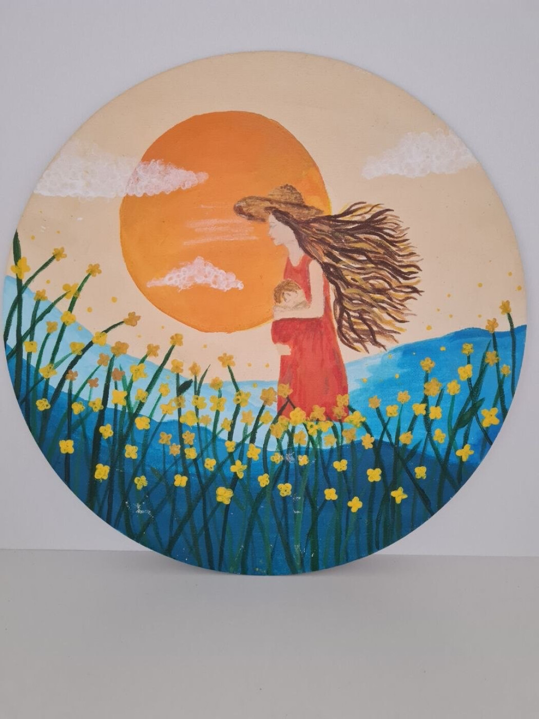 Я написала эту работу из простого, тёплого желания — запечатлеть момент спокойствия и защиты: мать, держaщую ребёнка, и большое тёплое солнце, которое кажется обещанием. Меня вдохновило летнее поле с жёлтыми цветами, ветер, играющий в волосах и шляпе, и ощущение бесконечного простора, которое хочется подарить малышу. Цвета — оранжевое солнце и синие холмы — помогли мне передать контраст тепла и тишины. В основе — личная память и мечта о безопасности, любви и лёгком движении жизни. И, честно, мне просто нравится рисовать развевающиеся волосы — в них для меня всегда живёт свобода.