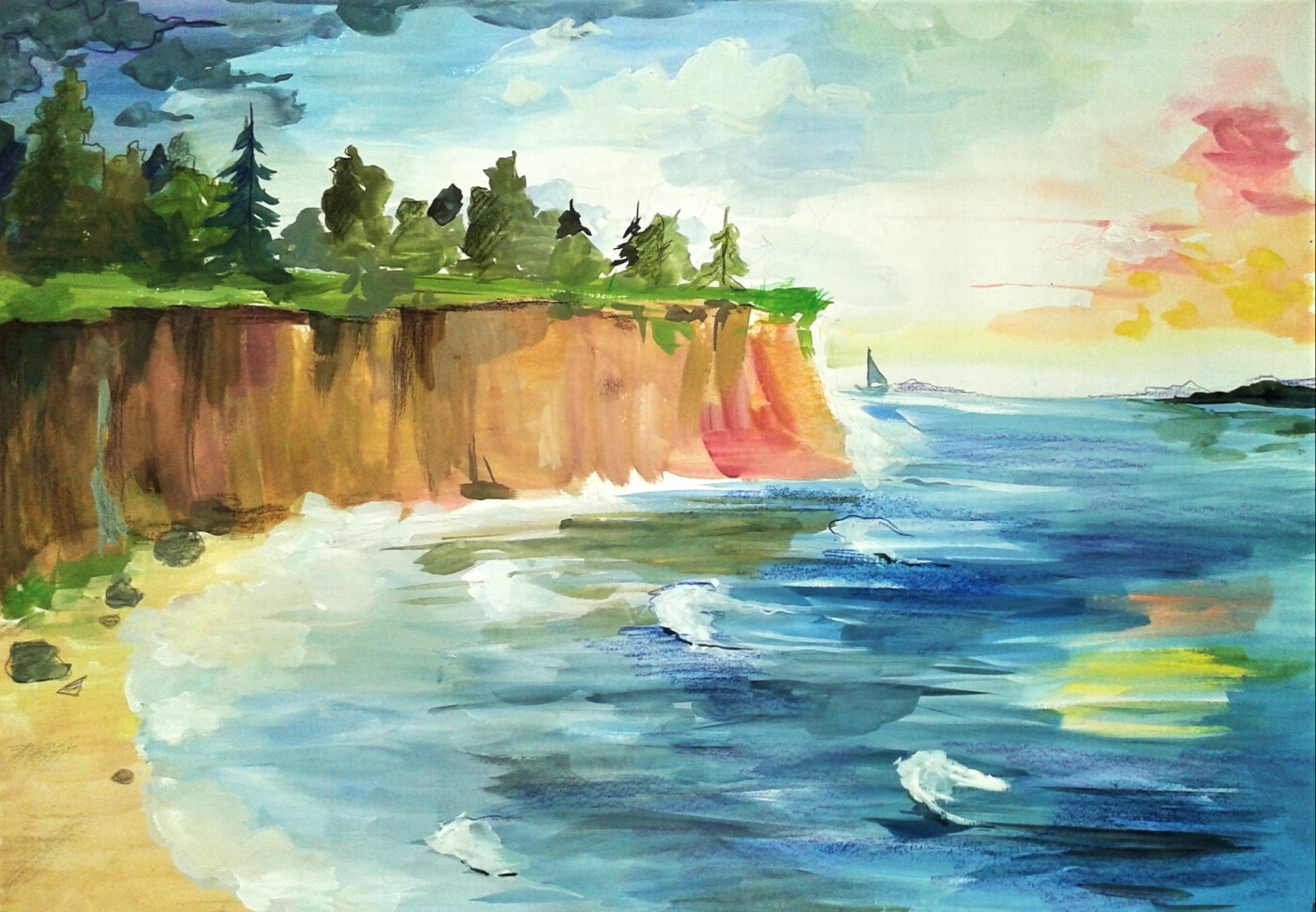 Добрый день. На рисунке берег реки Волга в Нижегородской области. В июле 2025 года я была в поездке на Метеоре по Волге. Виды были красивые: и пологие берега с деревеньками, и скалистые с деревьями и без. Природа у нас потрясающая, поэтому в пути фотографировала, а дома решила нарисовать.