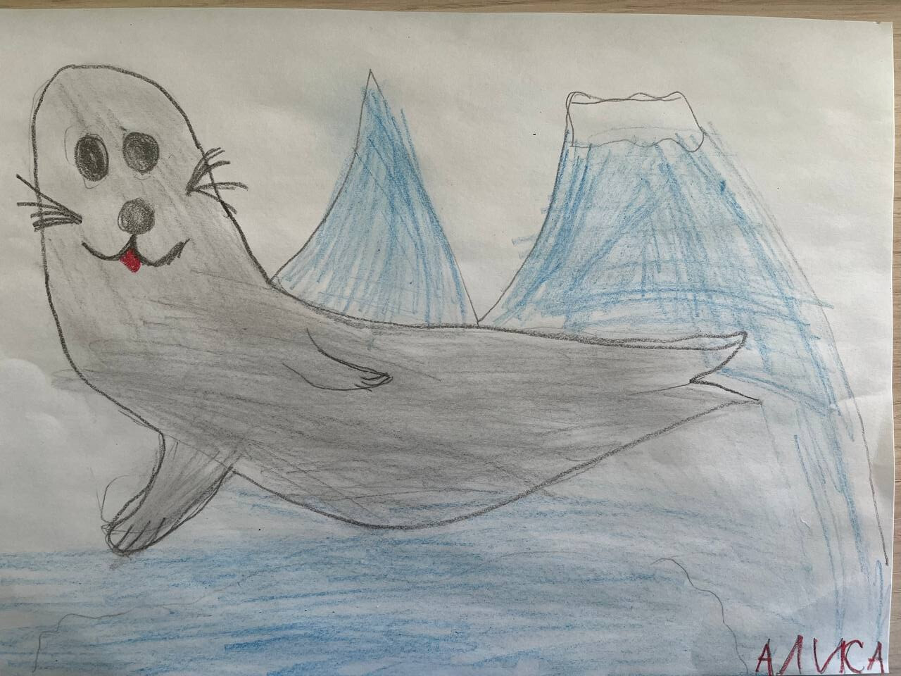 На моем рисунке — символ нашего священного озера, байкальская нерпа. Это самый добрый и милый обитатель Байкала. Я нарисовала, как нерпа отдыхает на льдине и с любопытством смотрит на мир своими огромными глазами. Она улыбается, потому что живет в самом чистом и красивом месте на Земле!