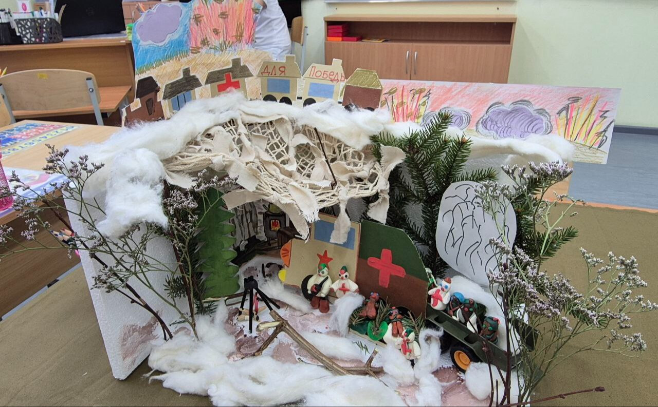 Диорама "Военная зима". Работа выполнена из пластилина и бросового материала. Сюжет: медпункт на войне зимой