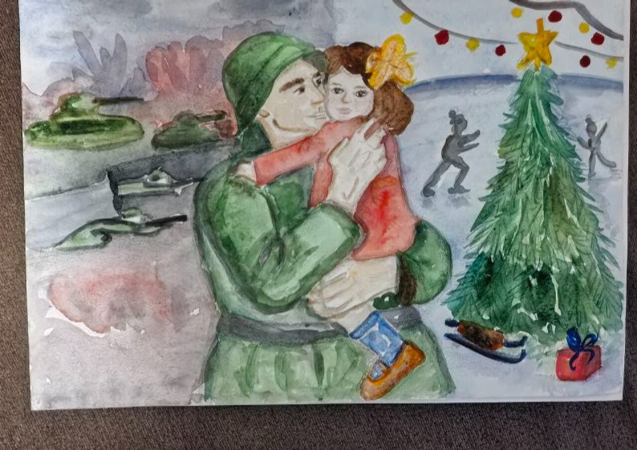 Нарисовала рисунок. На рисунке отец обнимает дочь. За его спиной бушует война, а за её — светлый праздник.