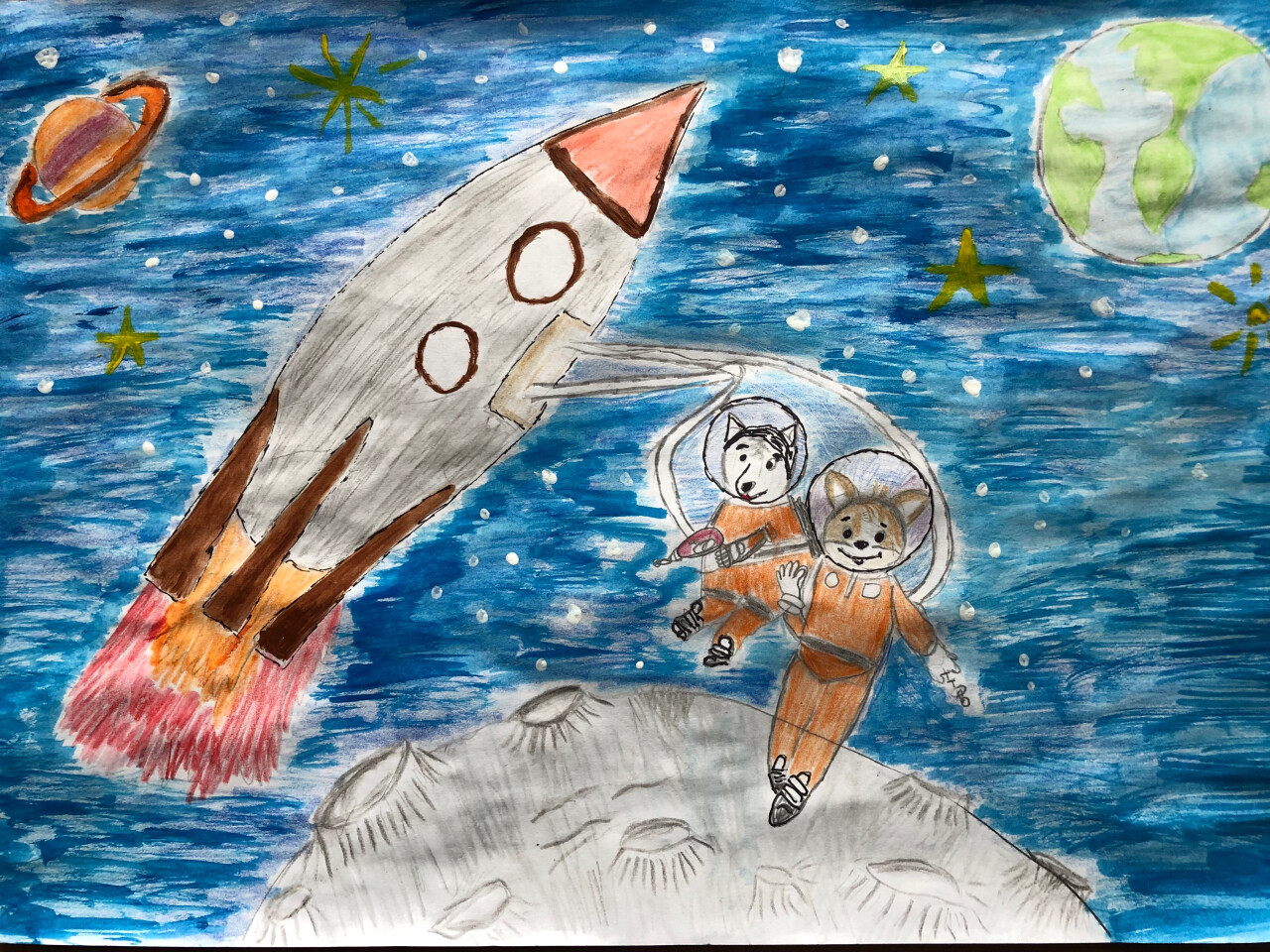 своим рисунком я передала свое видение космоса, после просмотра мультфильма про первых открывателей космоса «белку и стрелку».