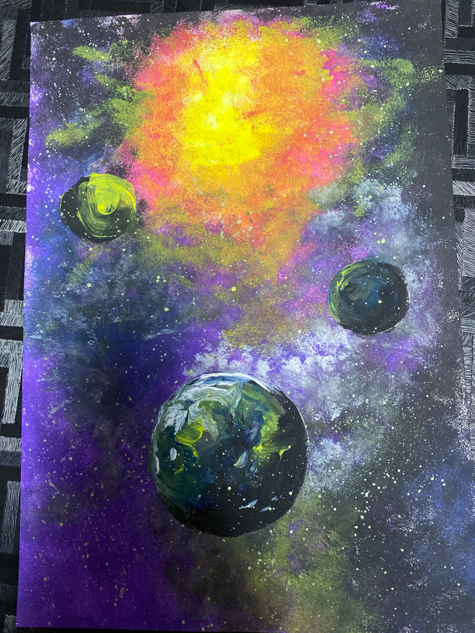 Этот яркий и динамичный рисунок переносит зрителя в космическое пространство, где переплетаются фантазия и абстракция. Вокруг звезды парят несколько планет или небесных тел, выполненных в зеленых и темных тонах с глянцевой текстурой, что добавляет им объемности и загадочности. Рисунок вдохновляет на размышления о бесконечности космоса и тайнах Вселенной.