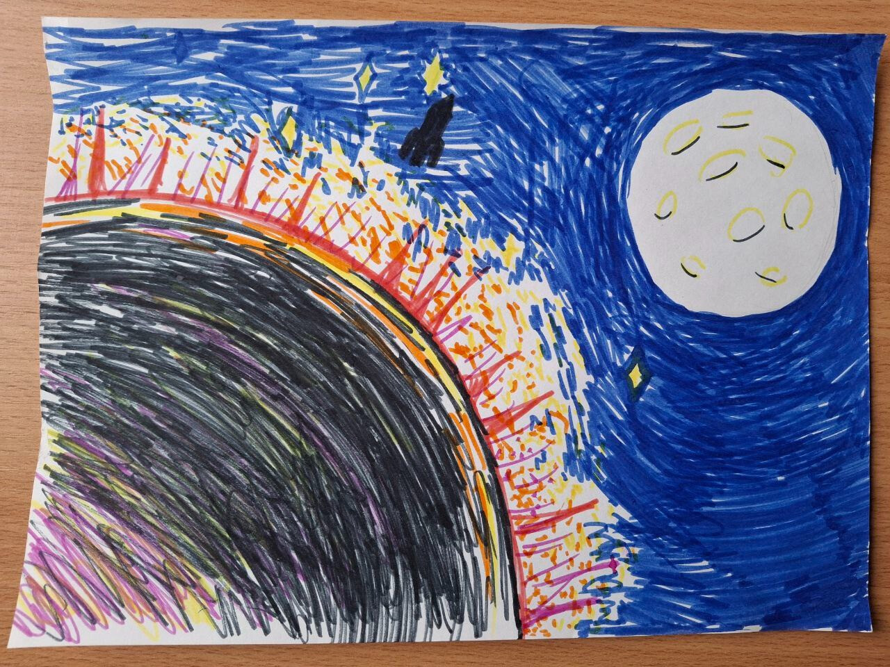 Насыщенные чернила фломастера оживляют перед нами панораму далекой галактики. Космическая пыль, словно акварельные разводы, переливается оттенками фуксии и лазури, создавая ощущение неземной легкости.