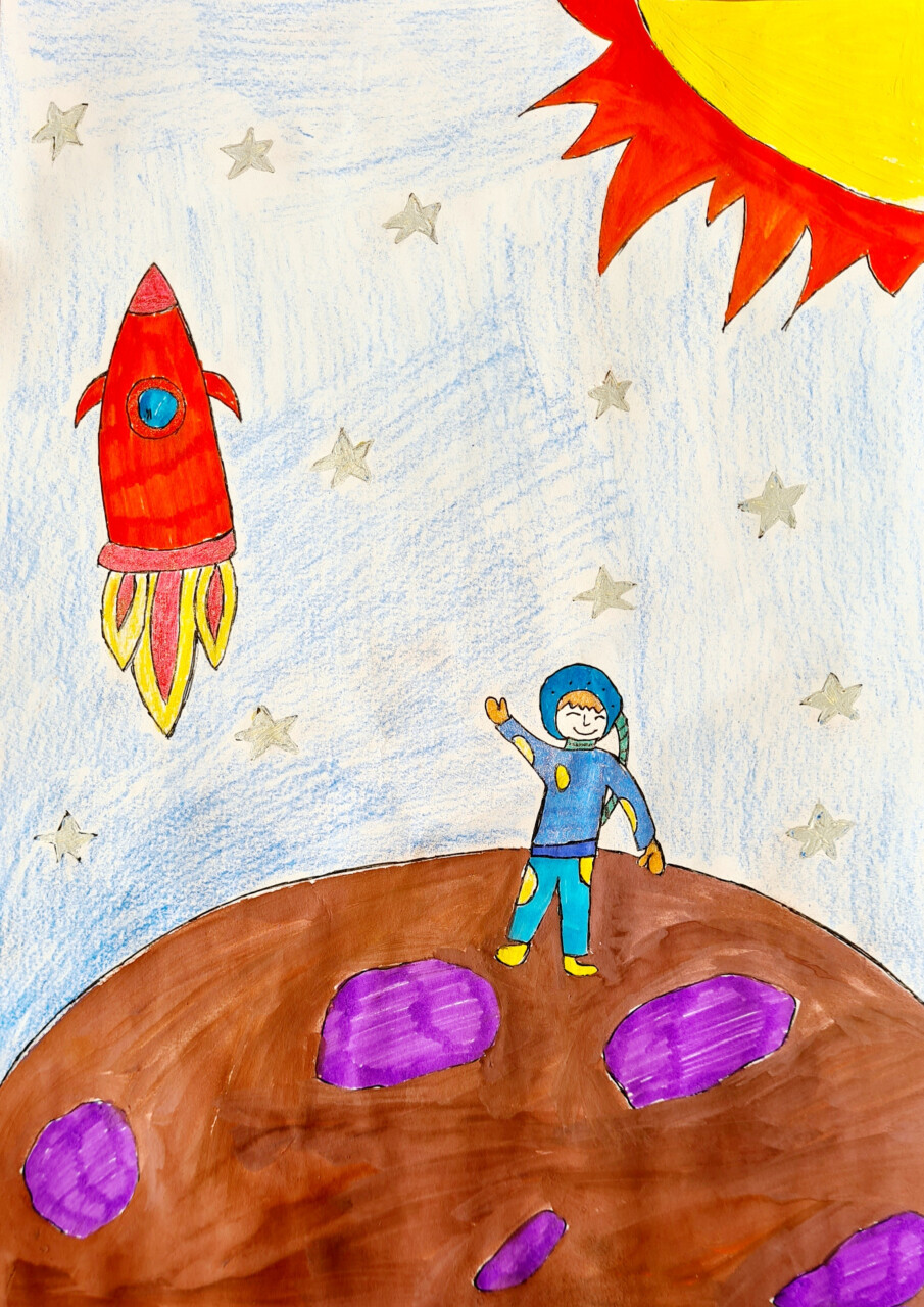 На рисунке красная ракета и космонавт - покоритель других планет. Не случайно цвет ракеты красный, это цвет флага СССР. А космонавт - это первый человек, отправившийся в космос - Юрий Гагарин, передает привет всем жителям Земли!
