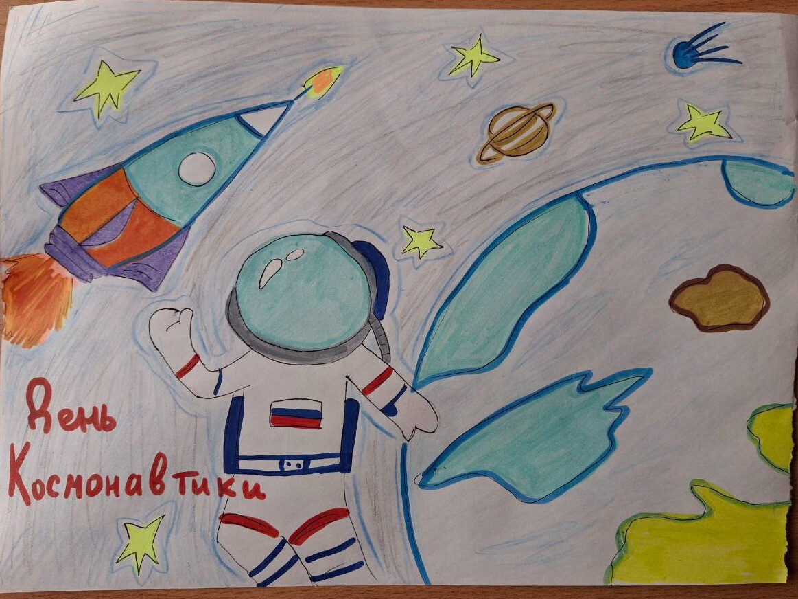 Работа, выполненная цветными карандашами. В самом центре композиции – фигура космонавта, облаченного в скафандр, отражающий в своем глянцевом покрытии свет мириадов звезд. Он парит в невесомости, словно танцор, исполняющий космический балет.