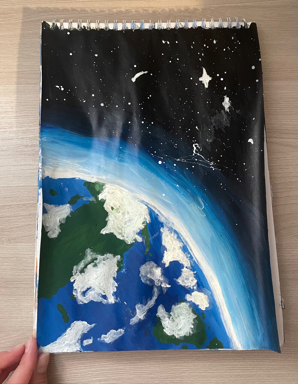Здравствуйте, меня зовут Петрова Арина Андреевна и я являюсь автором работы "вид планеты Земля из-за иллюминатора". Данную работу я написала акриловыми красками.