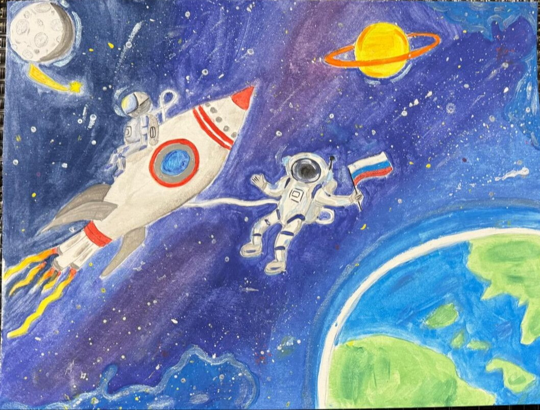 На моём рисунке я нарисовала космос и космонавтов ,а также попыталась передать красоту космоса. Космические туманности и звёзды придали картине яркость и более впечатляющий эффект. В моем рисунке также нарисованны планета Земля и её спутник Луна ,а также Сатурн. А два космонавта любуются этими красотами космоса и наслаждаются впечатлениями.