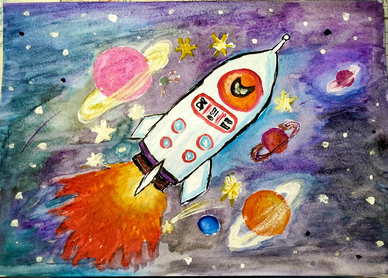 Привет! Меня зовут Соня, мне 7 лет. Я нарисовала ракету, которая мчится через космос! Она быстрая, как молния, и несётся к далёким планетам. Может быть, на ней летит космонавт — герой, как Гагарин!