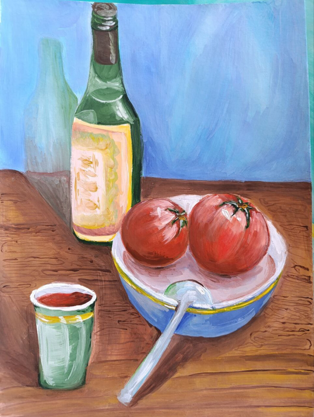 На работе изображена бутылка вина которая выражает тонкость вкуса и стиля. Так же неподалеку стоят тарелка с помидорами что напоминает содержимое стакана, своим ярким красным цветом будто рубин.