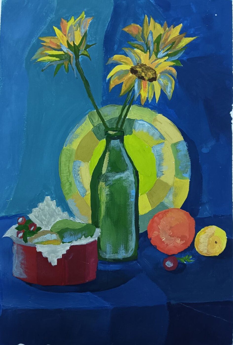 Работы выполнена гуашью.Вдохновлялась воспоминаниями о лете, в такое холодное время.Хотелось передать теплую атмрсферу летнего стола, а так же передать красоту подсолнухов, которые являются центром картины.