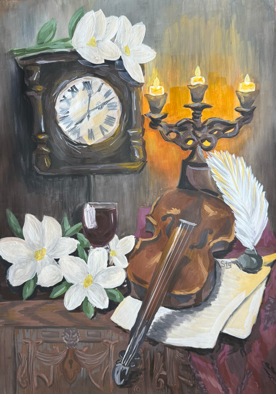 Работа передаёт настроение тихого вечера, когда музыка уже смолкла, свечи ещё горят, а часы продолжают отсчитывать время. Скрипка, перо и бокал вина создают образ творческого вдохновения, застывшего в мгновении.