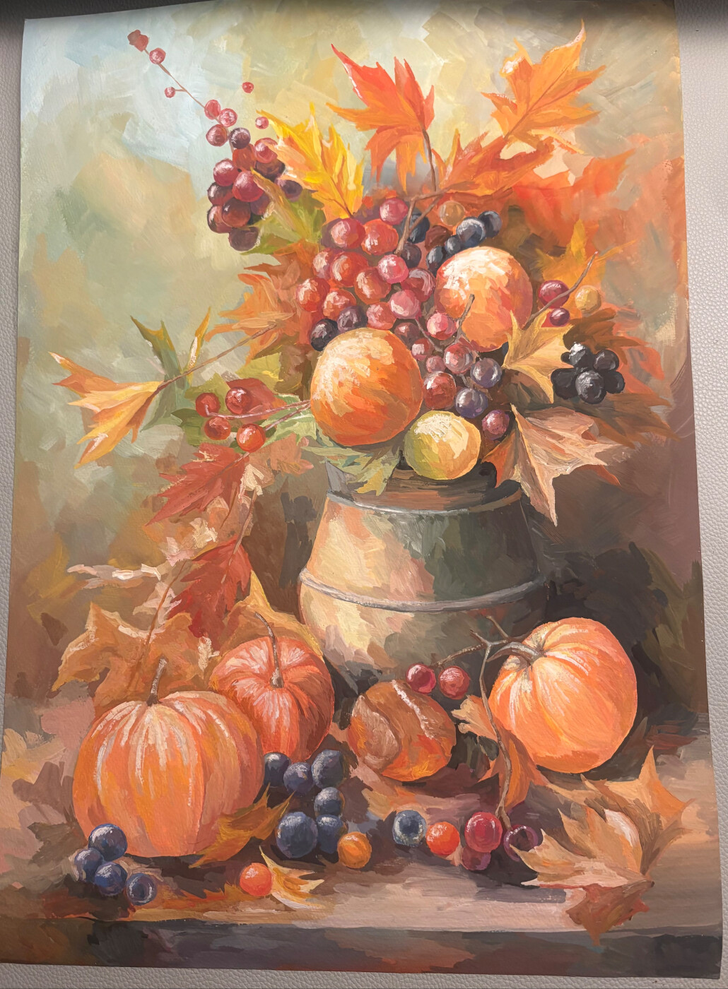 Это яркий осенний натюрморт, изображающий металлический кувшин с пышным букетом из осенних листьев, гроздей винограда и оранжевых плодов. Композиция дополнена тыквами, ягодами и опавшими листьями на переднем плане. Цветовая палитра теплая, с преобладанием оранжевых, красных и желтых оттенков на зеленовато-голубом фоне, создающая ощущение изобилия и уюта.