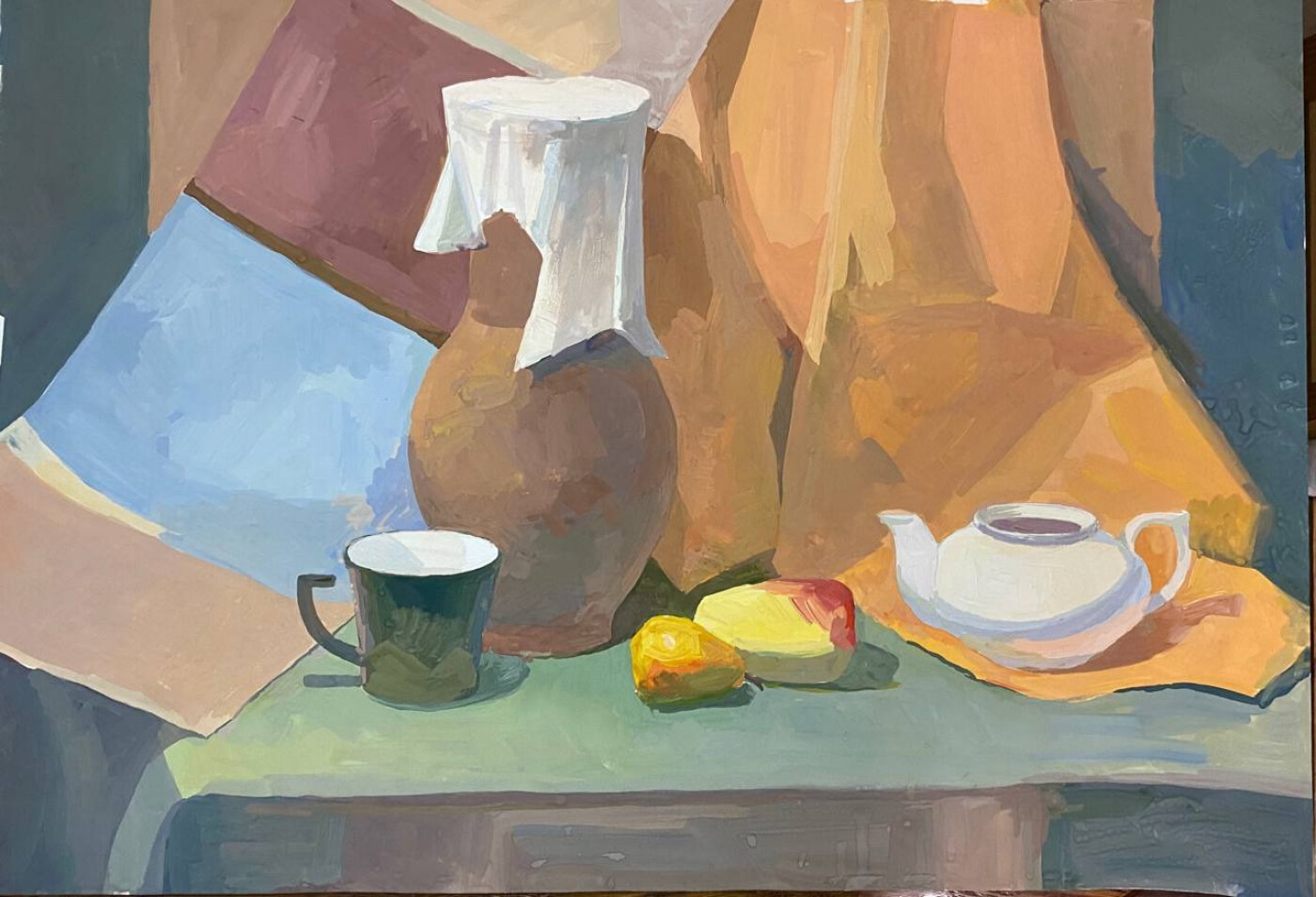 Натюрморт выполнен в классической академической манере с акцентом на игру света и тени. Центральным элементом данной композиции является глиняный кувшин, накрытый белой тканью, создающей интересный контраст с тёплыми оттенками фона. Справа от него — белый чайник с плавными линиями, добавляющий лёгкости. На переднем плане — кружка насыщенного зелёного цвета и два фрукта, придающие картине ощущение свежести и жизненности. Сзади фигур мы можем наблюдать драпировки разных оттенков. Цветовая гамма построена на сочетании тёплых охристых тонов с холодными зелёными и голубыми акцентами, что создаёт гармоничное равновесие. Композиция сбалансирована, каждый предмет занимает своё место, формируя цельный образ домашнего уюта.