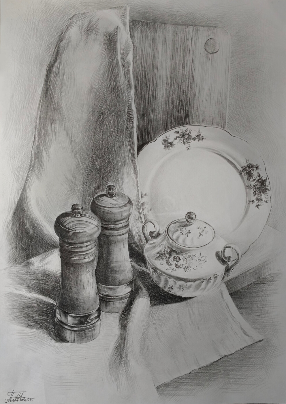 В данном натюрморте представлена гармония простоты и изысканности, где каждое изделие рассказывает свою историю. Две деревянные перечницы, с их естественной текстурой и теплотой дерева, символизируют традиции и домашний уют. Их форма и цвет создают ощущение близости к природе, подчеркивая важность натуральных материалов в нашем окружении.