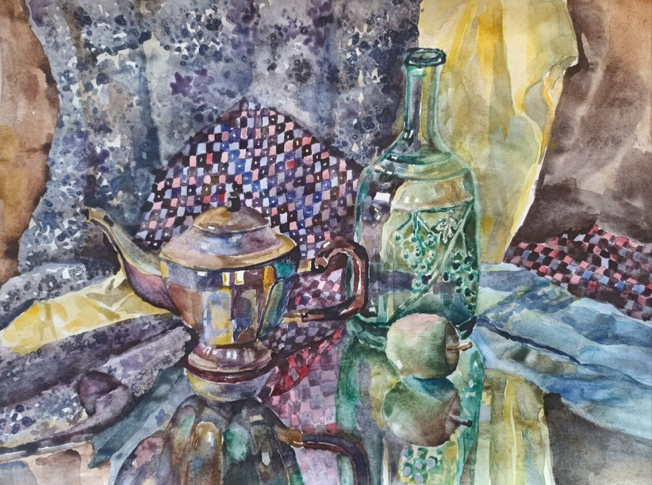В этой работе я хотела раскрыть красоту отражений и рефлексов. Все предметы натюрморта стоят на стеклянном подносе, что делает постановку ещё интереснее.