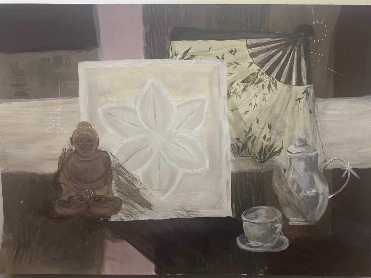 Декоративный натюрморт, построенный как состояние зафиксированного равновесия. Предметы воспринимаются как формы, удержанные в одном моменте, где неподвижность становится смысловым центром композиции. Работа выполнена акрилом с акцентом на плоскостность, фактуру и тональные соотношения.