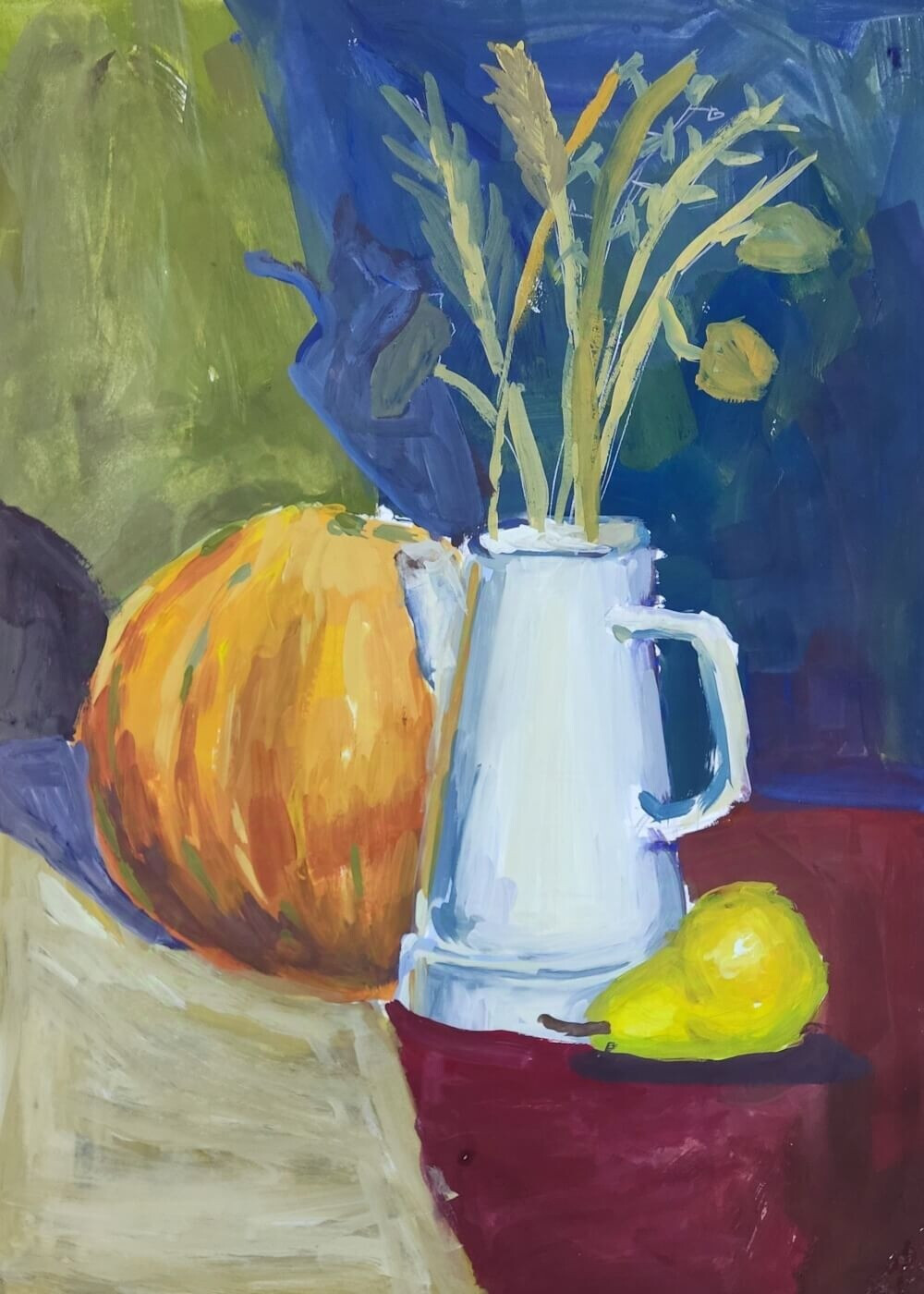 На моем натюрморте, выполненный в стиле импрессионизма. В центре композиции находится белый кувшин с ручкой, в котором стоят стебли растений с желтыми листьями. Слева от кувшина расположен оранжевый плод, это тыква а справа - желтый плод, груша. Фон картины выполнен в зеленых и синих тонах, Стиль картины характеризуется мягкими, размытыми мазками, создающими ощущение легкости и воздушности.
