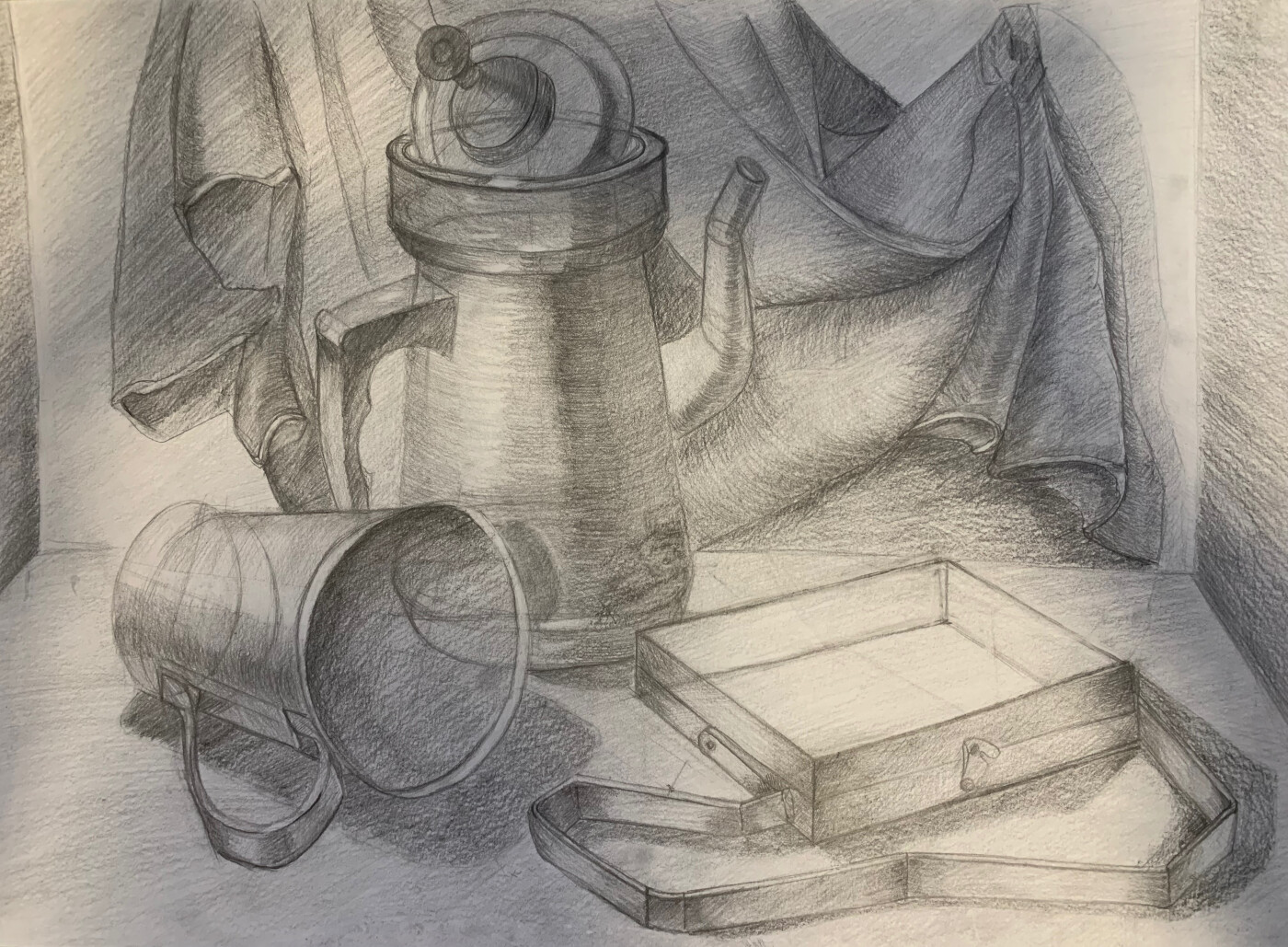 Работа выполнена карандашами разной мягкости. На работе(формат А3) представлено три предмета быта ,на фоне драпировка.