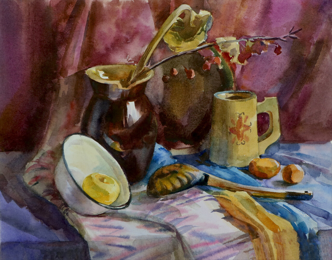 Тематический натюрморт из предметов, контрастных по цвету. 2025. Б. акв. 41,5х51.