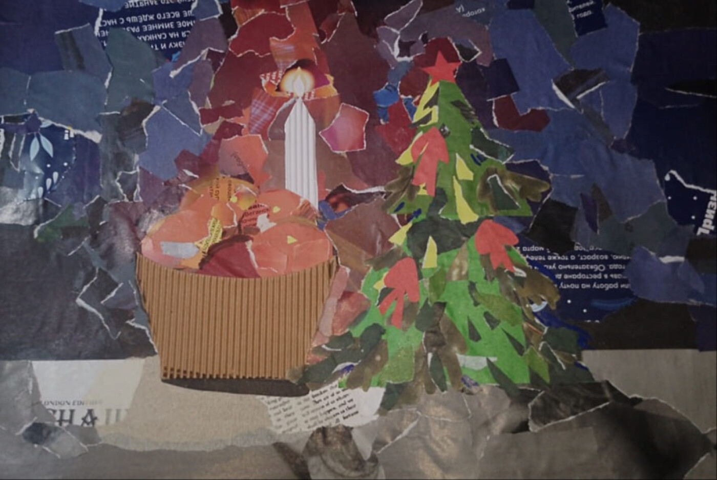 Моя работа "Теплота под бой курантов" - это эмоциональный натюрморт, выполненный в технике коллажа. Он показывает знакомую всем картину - одинокая, но яркая свеча освещает тарелку с мандаринами и пусть маленькую, ео олицетворяющую ожидание чуда ëлочку. Каждый клочок бумаги в этой работе – словно осколок воспоминаний, сложившийся в трогательную картину домашнего уюта и предновогодней магии.