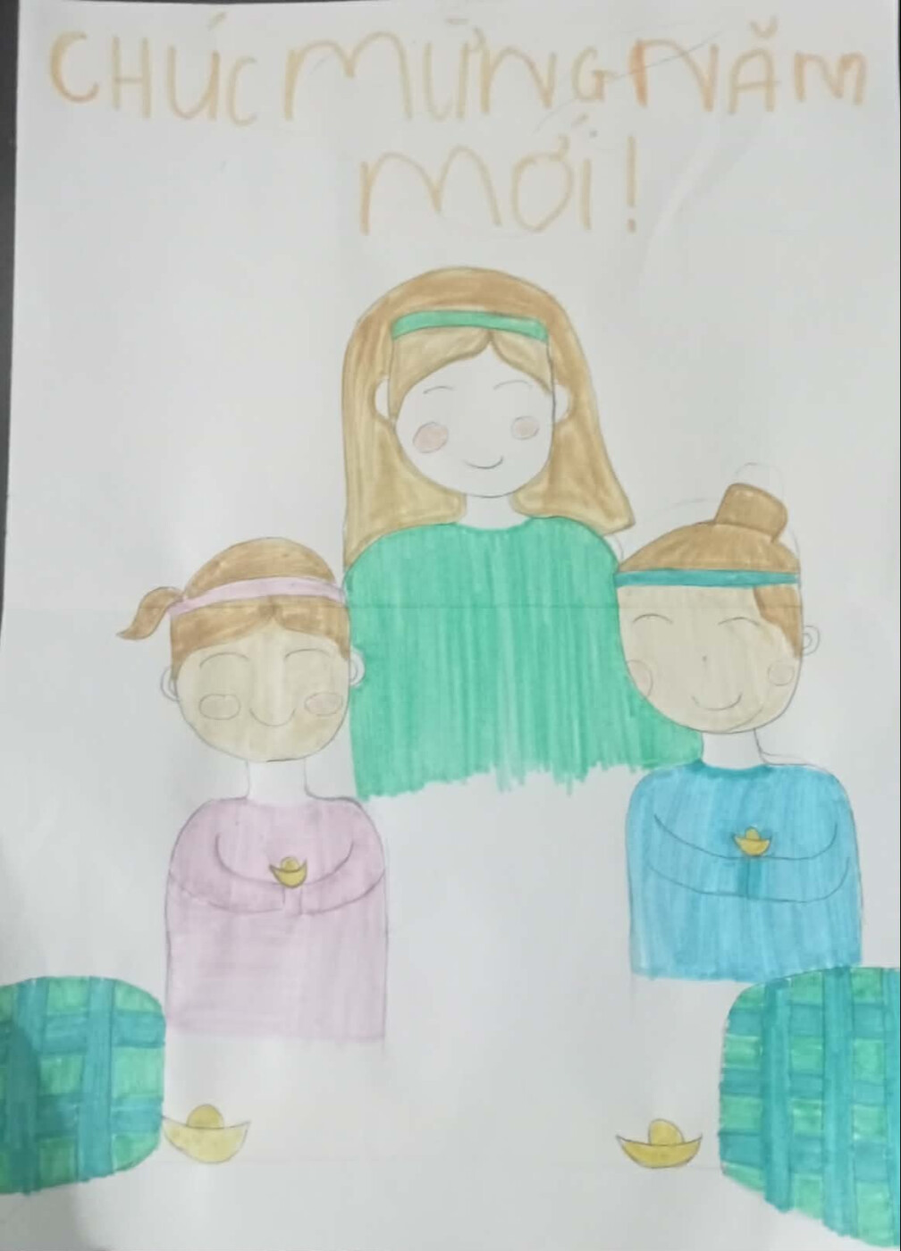 Слова «С Новым годом» — это не только знакомое приветствие вьетнамцев во время Тэта, но и выражают пожелание мира, счастья и любви каждой семье. Через картину я хочу познакомить международных друзей с образом вьетнамского Тета, простым, теплым и богатым человеческими ценностями.