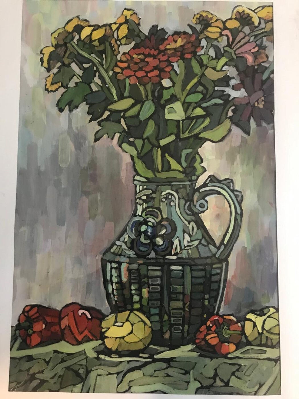 Натюрморт выполнен в технике гуаши и представляет собой стилизованное изображение. Центральным элементом композиции является ваза с цветами, которая имеет сложный орнамент и выполнена в темных тонах с акцентами синего и зеленого цвета.