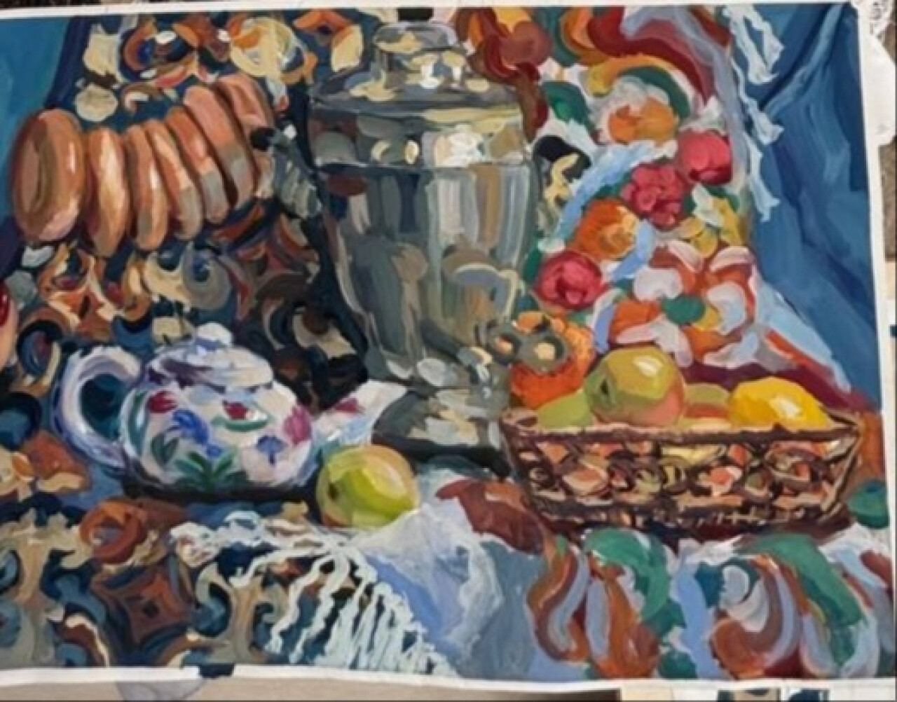 На картине изображено русский обычай пить чай из самовара,это создаёт уютную атмосферу.Красота русских платков наполняет картину яркими. красками. Натюрморт выполнен гуашью.