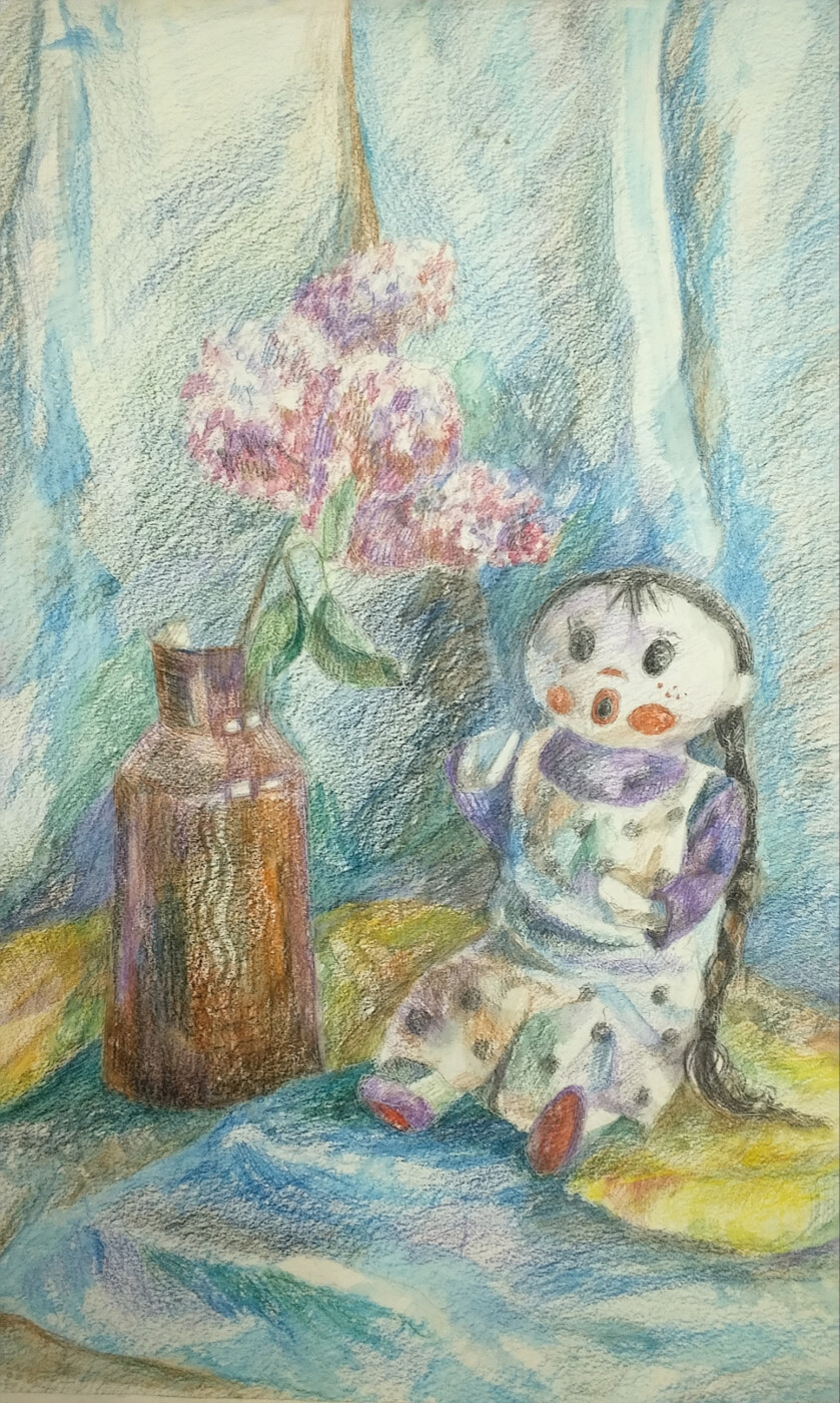 Натюрморт с куклой, материал акварельные карандаши, размер 50×60, автор работы Гришачкова Елена Владимировна