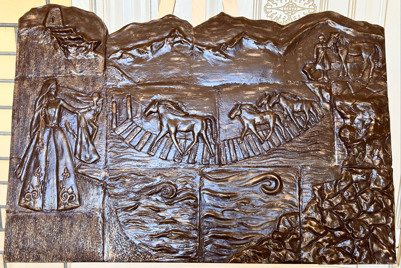 Настенное панно ручной работы, выполненное из керамики. Вдохновением для создания данной работы послужила легенда о башне «Адиюх». На панно изображены величественные горы, олицетворяющие силу и неприступность природы. Главными персонажами выступают горец и горянка.