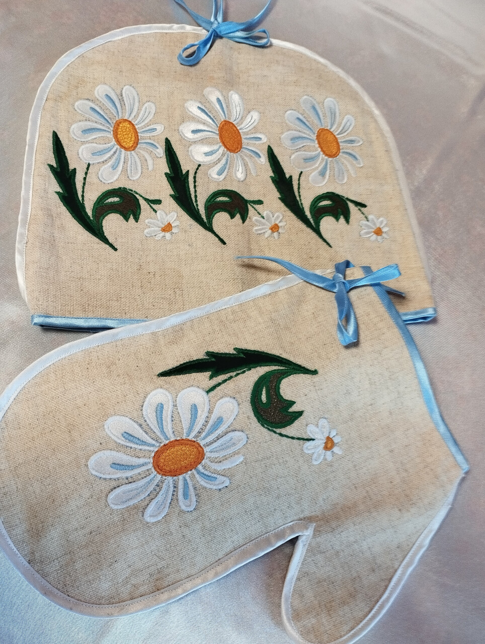 Кухонный комплект сшит из льняной ткани и дополнен аппликацией с элементами глади.