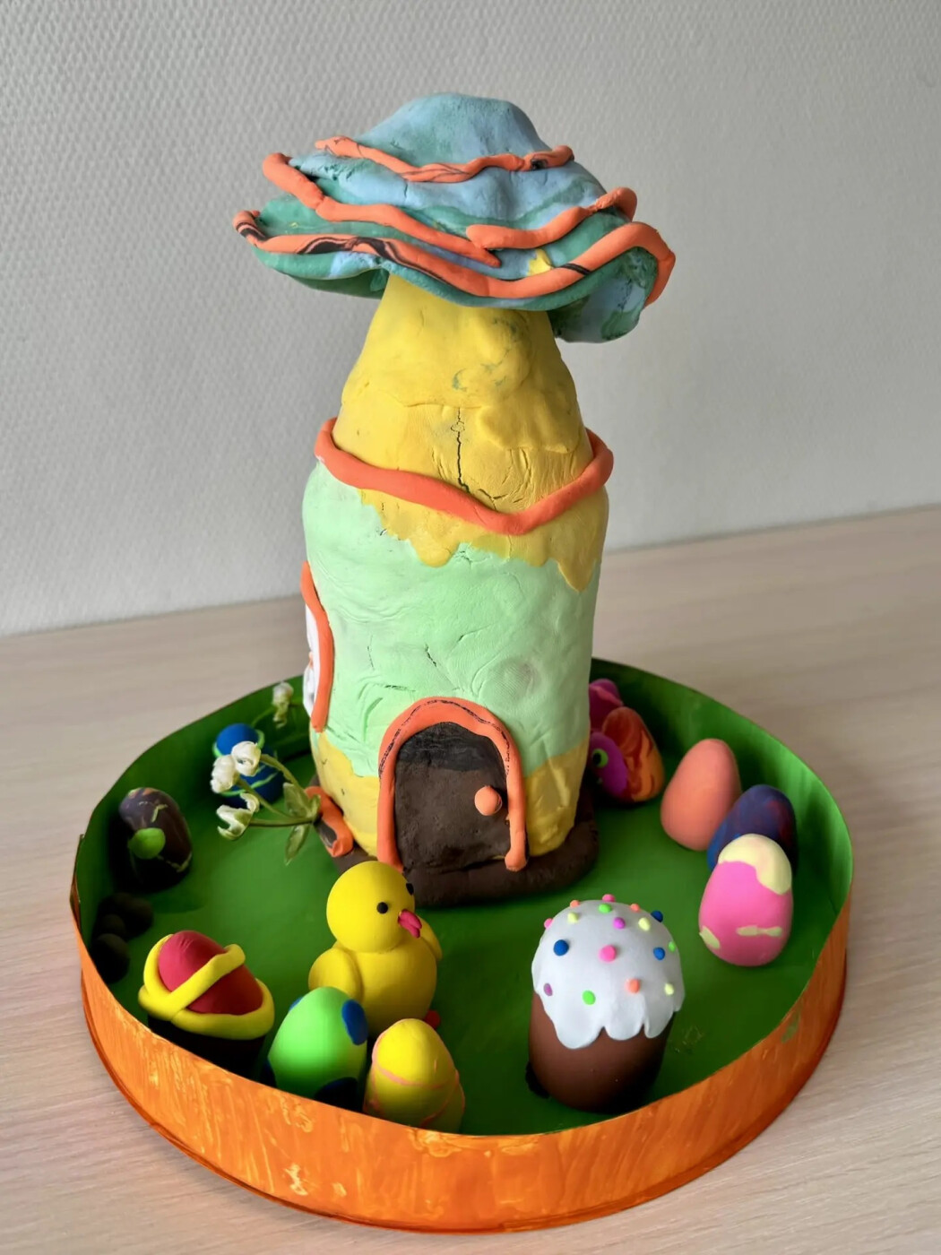 В центре внимания трогательный цыплёнок, символ новой жизни и весны. Рядом с ним расположены главные пасхальные атрибуты: праздничный кулич и крашеные яйца.