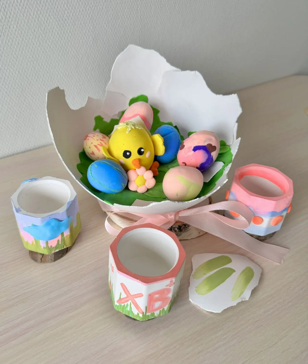 Центральный элемент большое гипсовое яйцо, внутри которого находится трогательный цыплёнок и маленькие яички из воздушного пластилина. Рядом расположены декоративные формочки из гипса, расписанные акриловыми красками. Они универсальны: могут использоваться как подставки для пасхальных яиц или как оригинальные подсвечники.