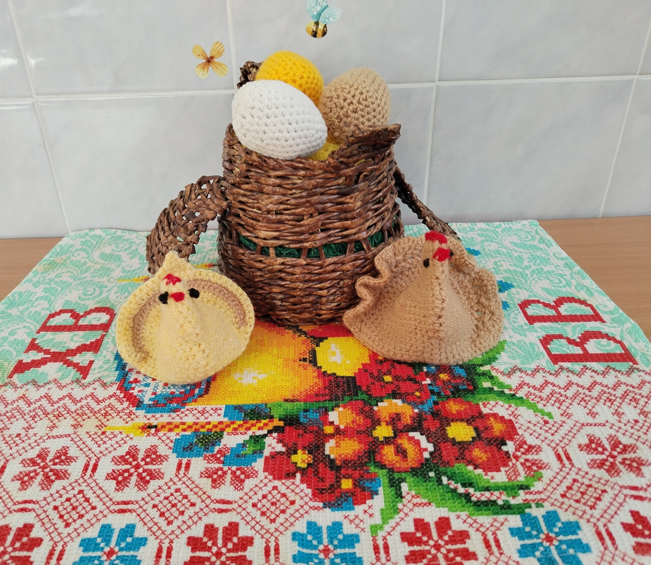 Корзина сплетена из газетных трубочек, курочки и яйца связаны крючком.
