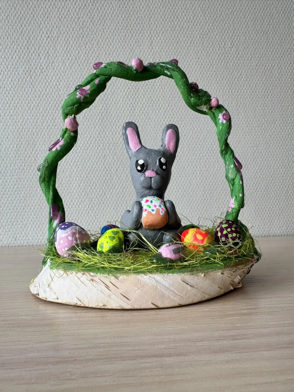 Пасхальный сувенир представляет собой уютную композицию, в центре которой — трогательный зайчик. Фигурка зайца и яйца тщательно вылеплены из полимерной глины. Расписано всё акриловыми красками.