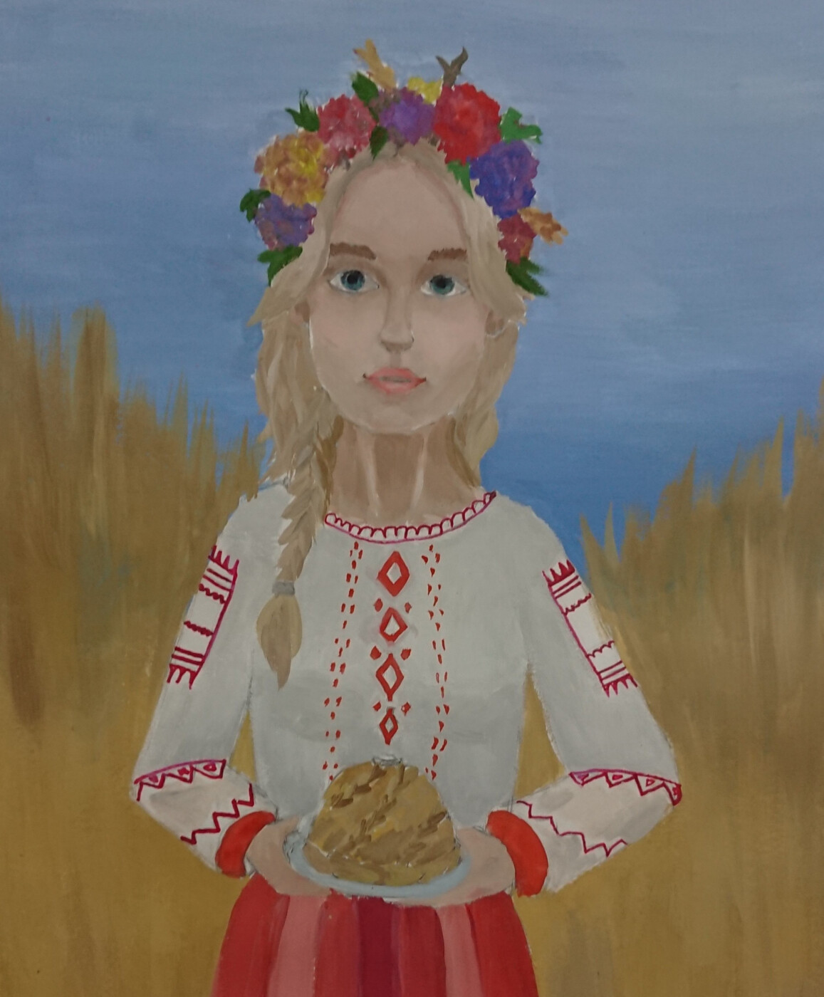Авторская уникальная творческая композиция-портрет «Девушка с караваем» выполнена на акварельной бумаге форматом А3, акварель. Образ создан в национальной традиции народов России: девушка в красивом национальном наряде, на голову обрамляет венок, в руках каравай-символ гостеприимства, хлебосольства. Фон – пшеничное поле, символ мира и добра.