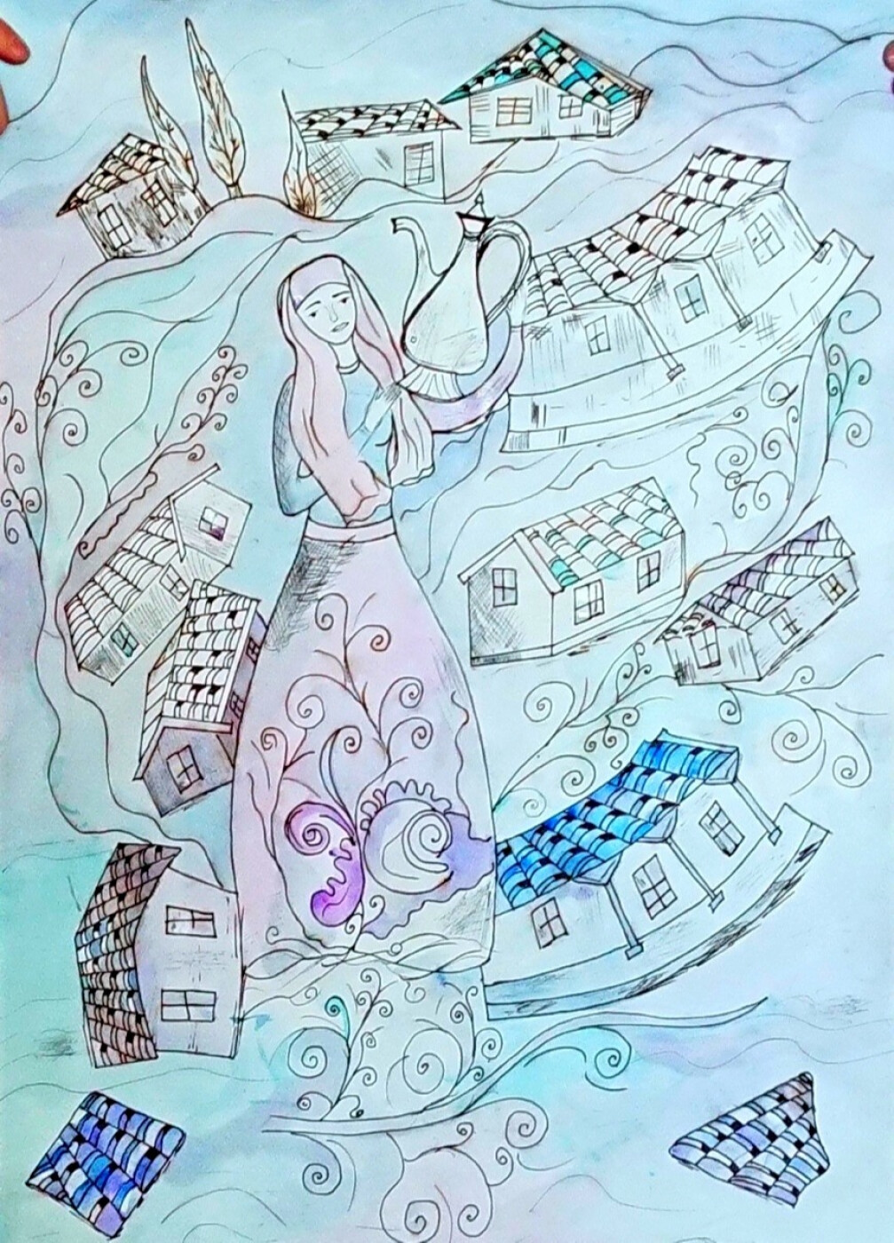 Авторская уникальная творческая тематическая работа «Хранительница семейного очага и живой воды» выполнена на акварельной бумаге форматом А2, акварель с добавлением графики. Композиция раскрывает роль женщины в сохранении традиций народов Крыма.