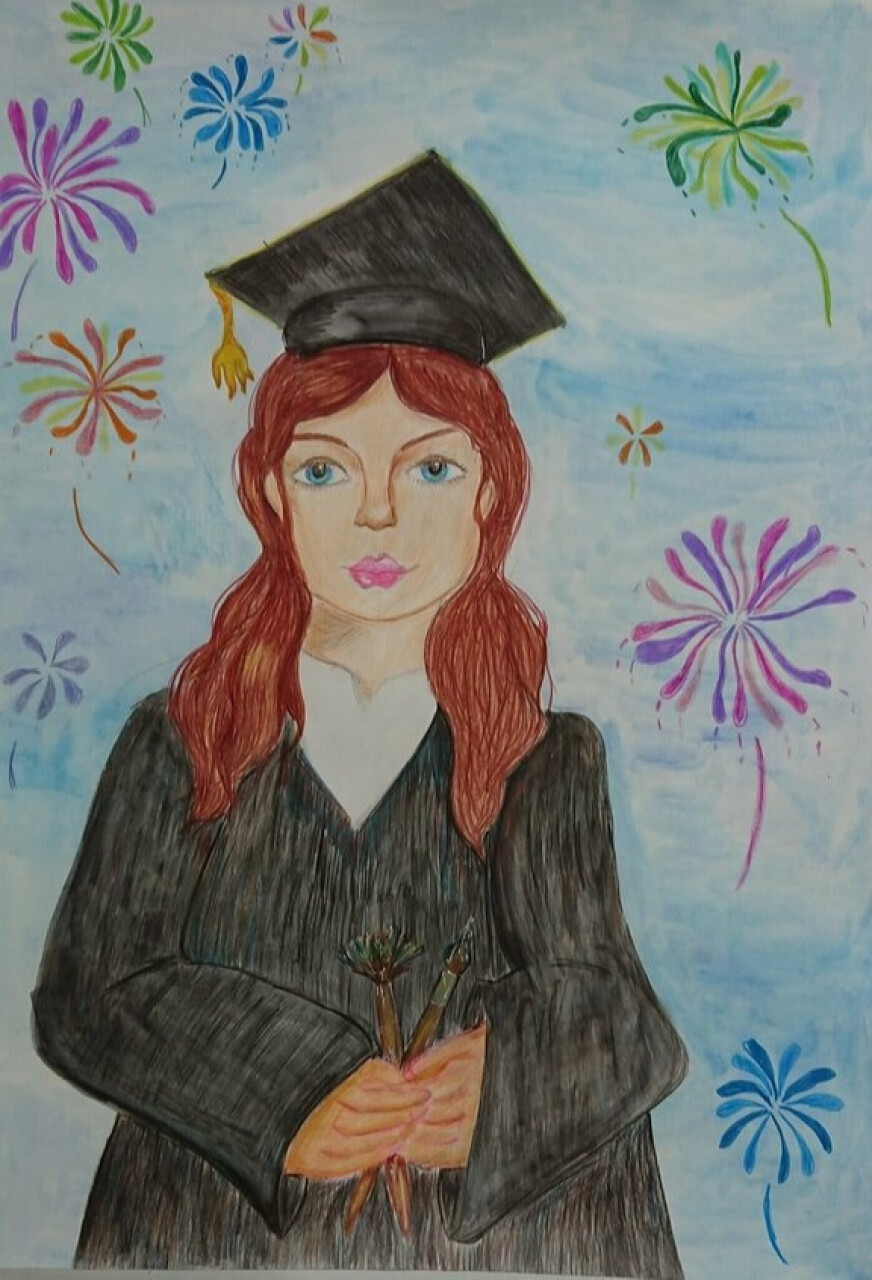 Творческая авторская композиция, выполненная цветными карандашами на формате А2. Образ девушки-выпускницы ВУЗа, ставшей художником.