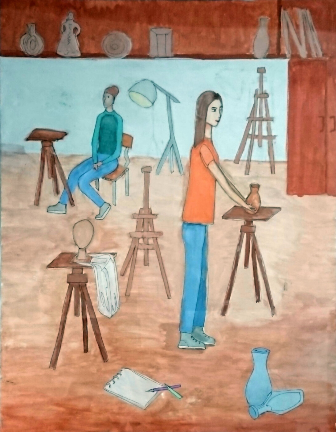 Авторская уникальная творческая тематическая работа «Мой учитель скульптуры в скульптурной мастерской учит нас» выполнена на акварельной бумаге форматом А2, живопись, гуашь. Композиция раскрывает роль женщины - преподавателя в познании навыков скульптуры.