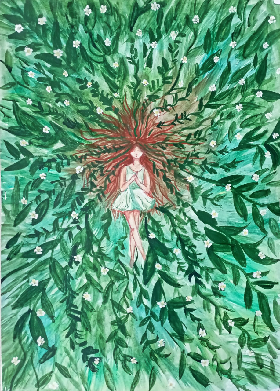Моя работа называется 'Девушка Весна'. На ней запечатлена хрупкая, юная девушка, словно само воплощение пробуждающейся природы. В её облике чувствуется нежность первых подснежников и лёгкость весеннего ветерка. Она – символ обновления, зарождающейся жизни и той трепетной красоты, что приходит с теплом.