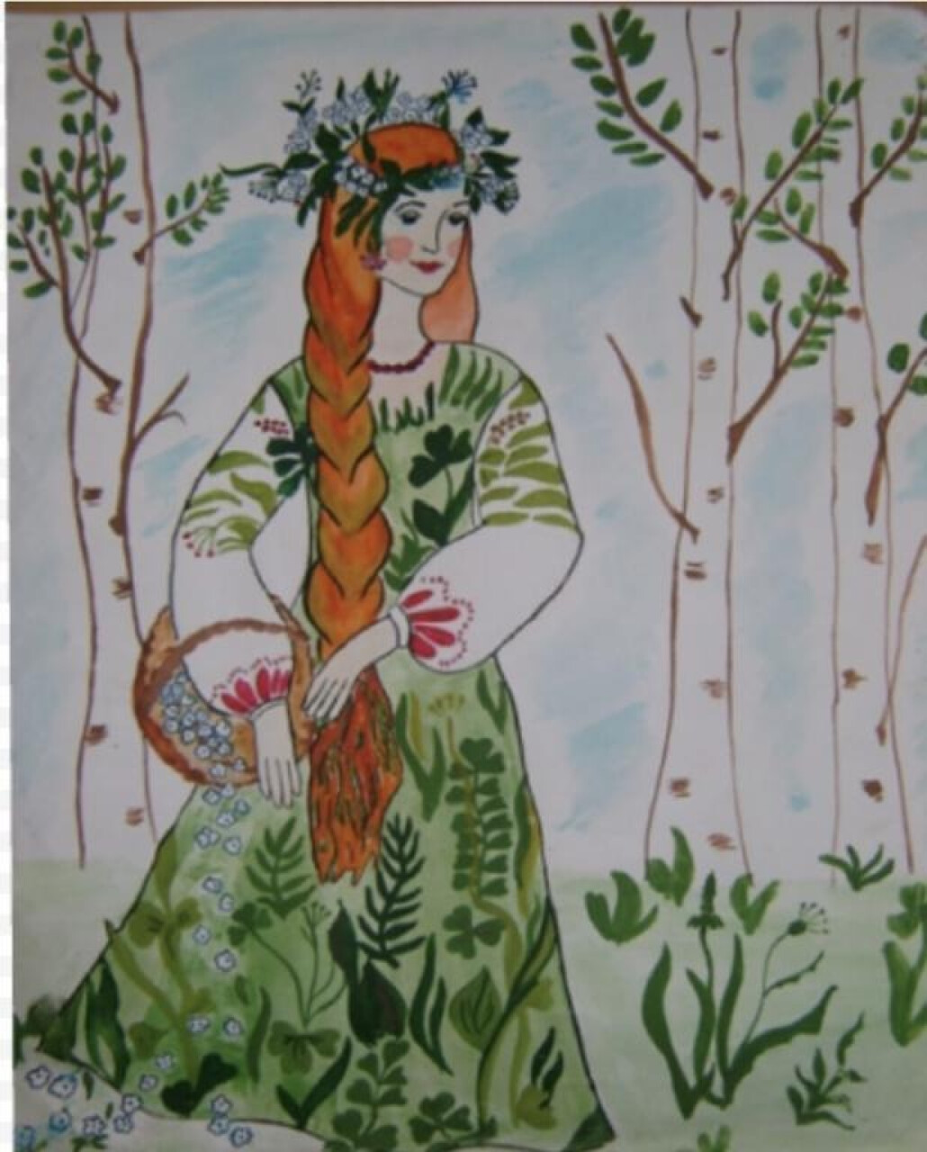 На моем картине девушка в зелёном платье с узорами, которая стоит среди деревьев. У неё длинные рыжие волосы, заплетённые в косу, и на голове венок из цветов. Она держит в руках корзину с цветами.