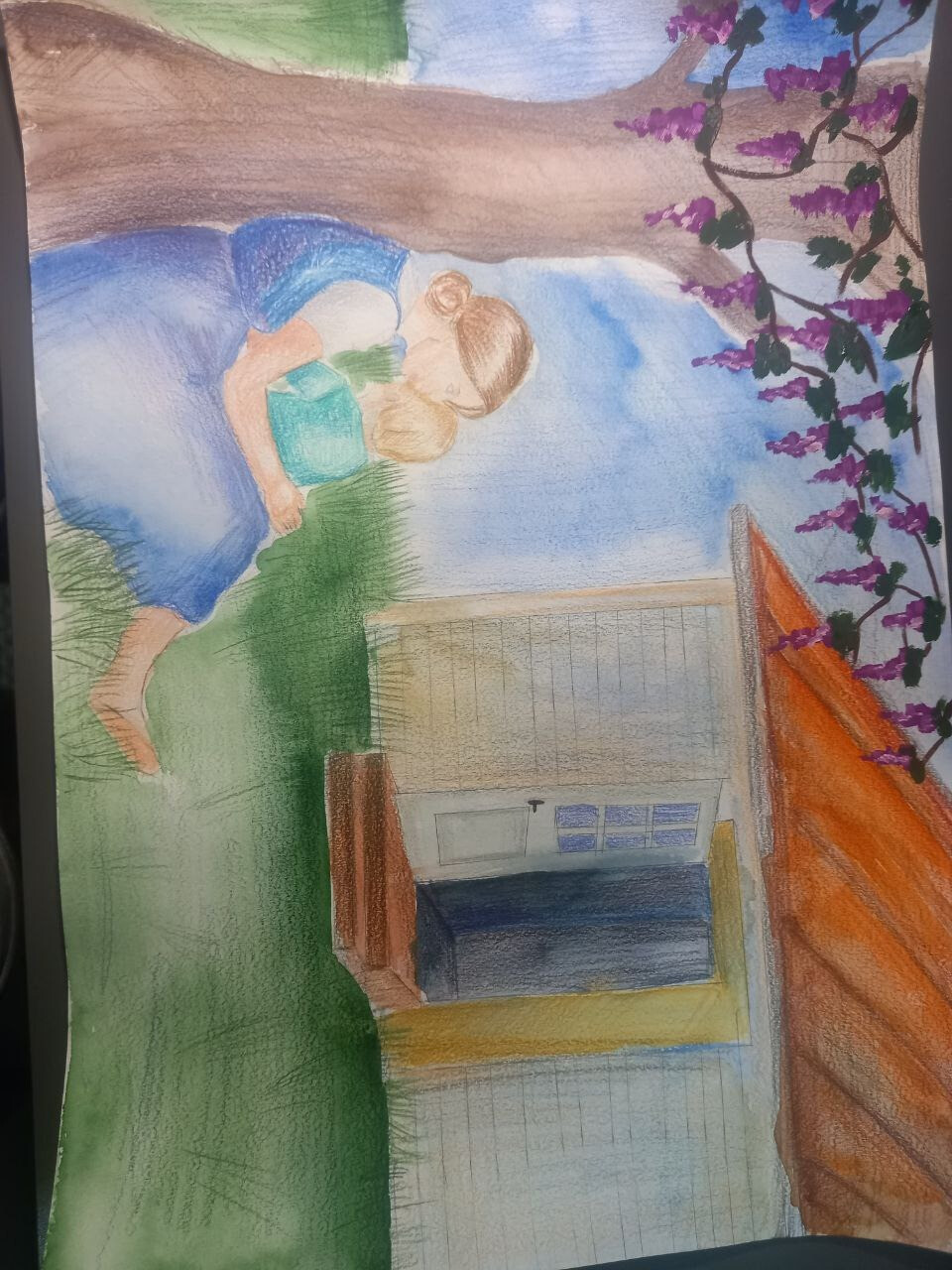 На моей работе изображена женщина с ребёнком, возле своего дома как символ жизни