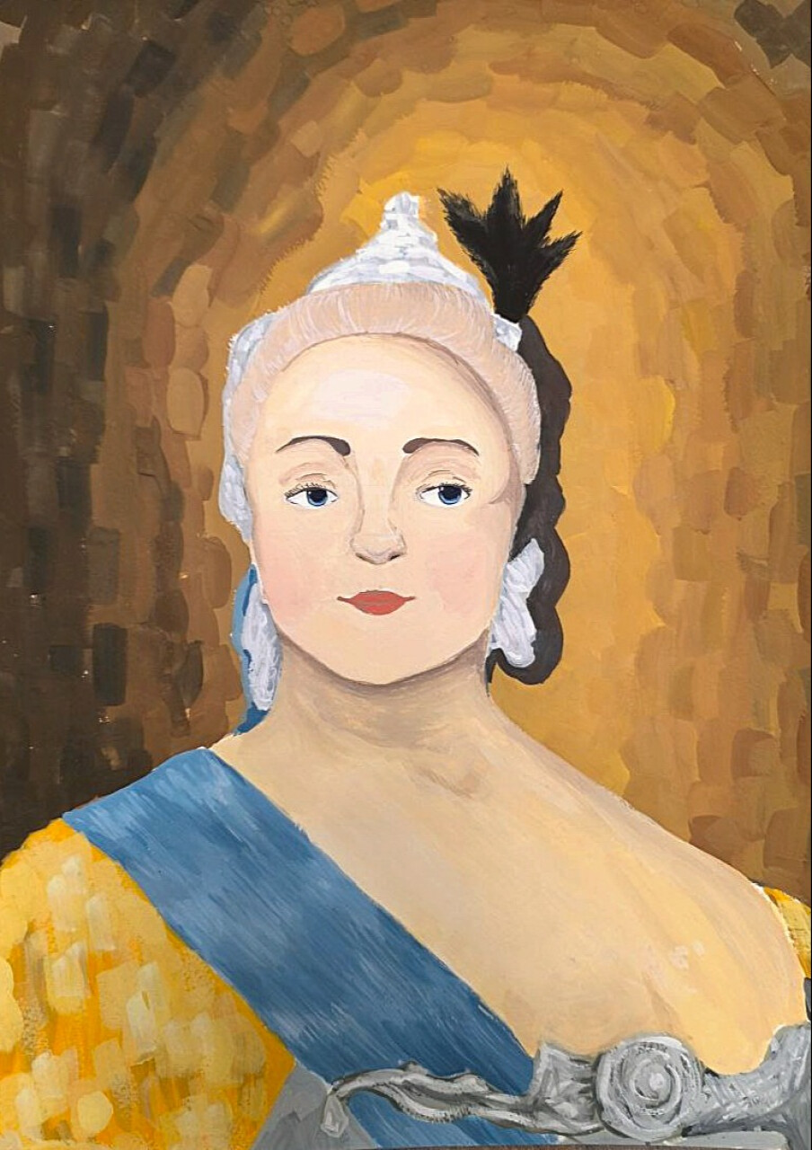 На портрете изображена величественная императрица, облаченная в роскошное платье. Лицо императрицы излучает уверенность и мудрость, а её глаза, полные глубины, словно рассказывают о многолетнем правлении и пережитых испытаниях.