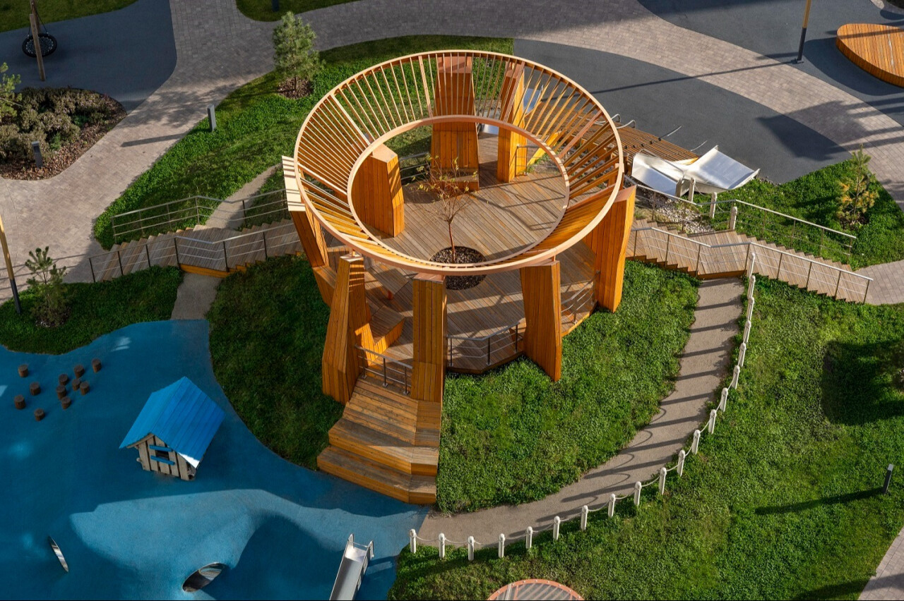 В «лесу» висят гамаки, на «озере» плавают утки, на памп-треке едут самокатчики, на «горе» висит качель.