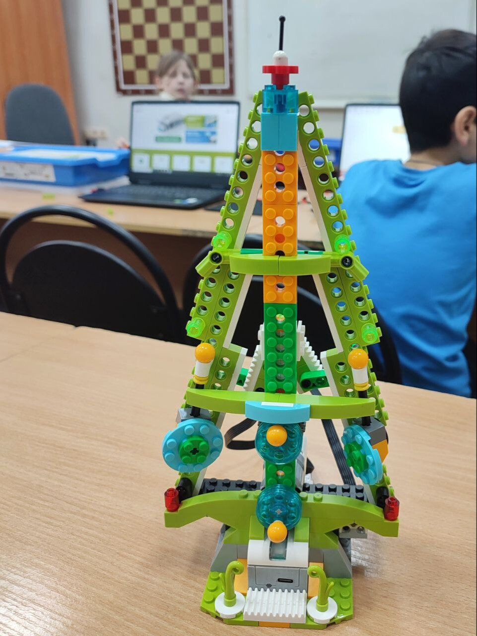 Новогодняя ёлка из лего Wedo 2.0. Ёлка крутится влево и вправо, увешена шариками, некоторые из которых тоже крутятся